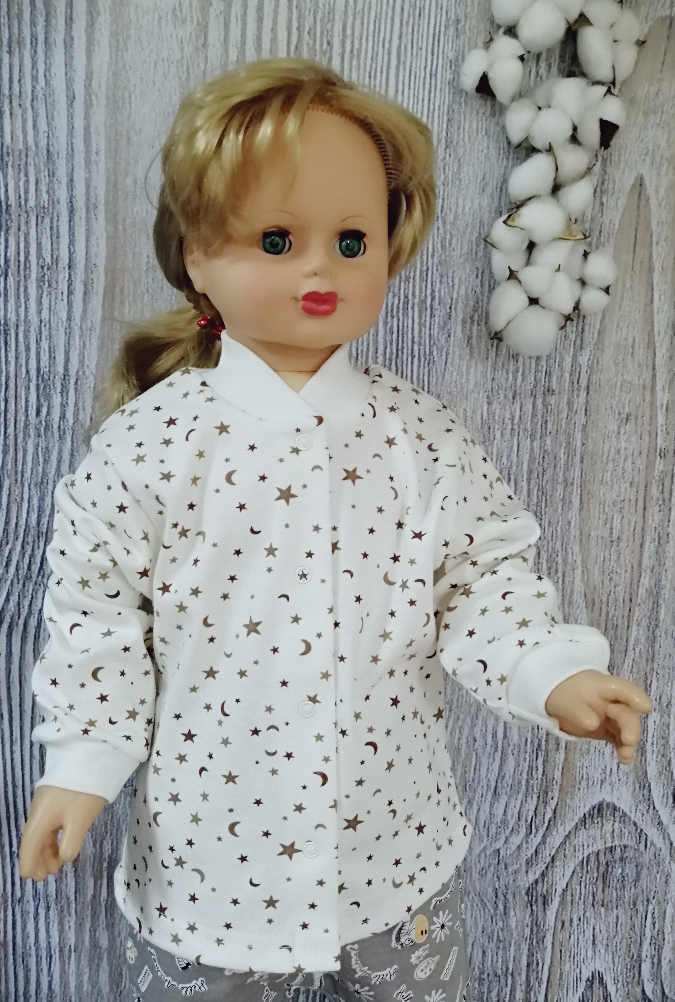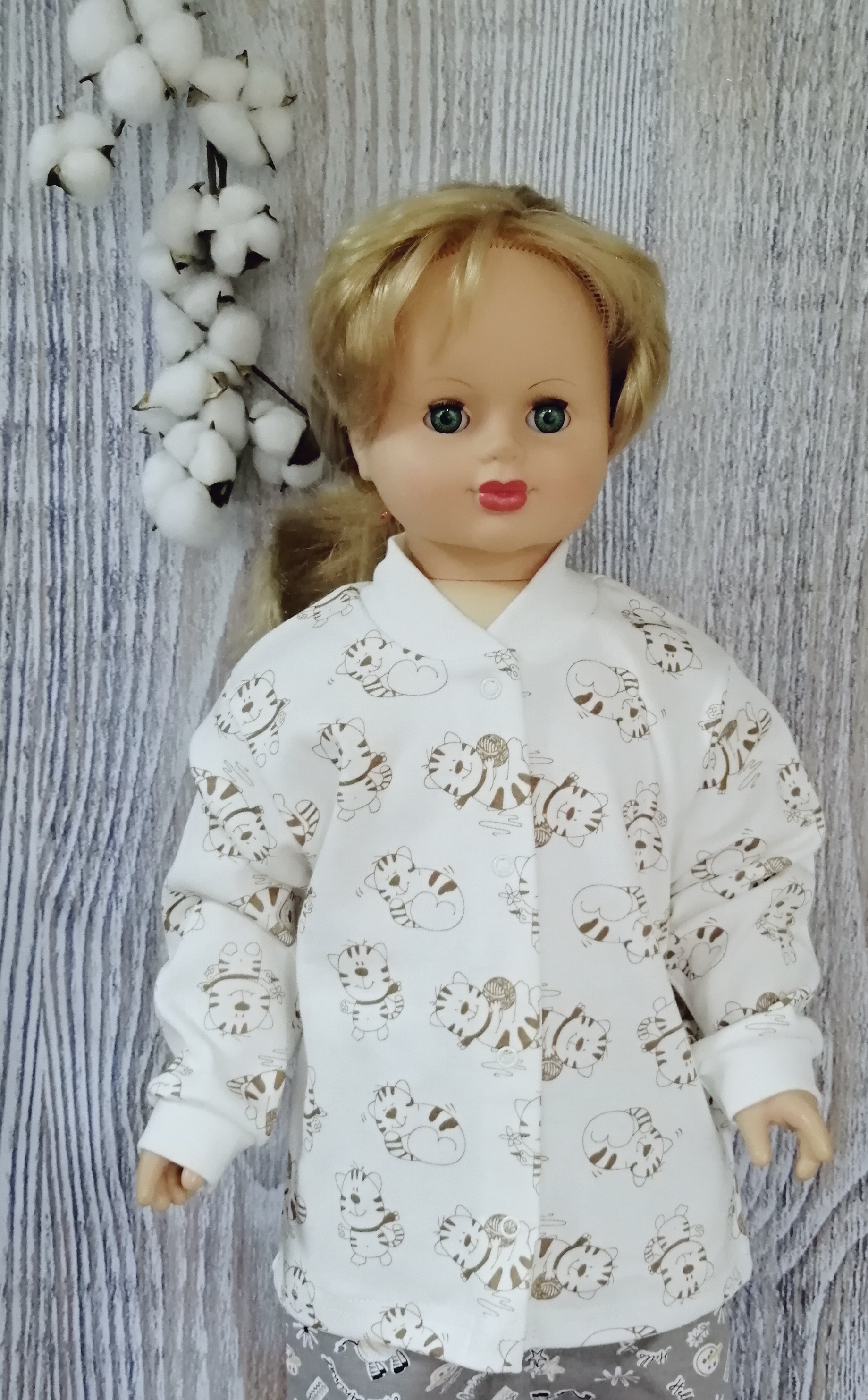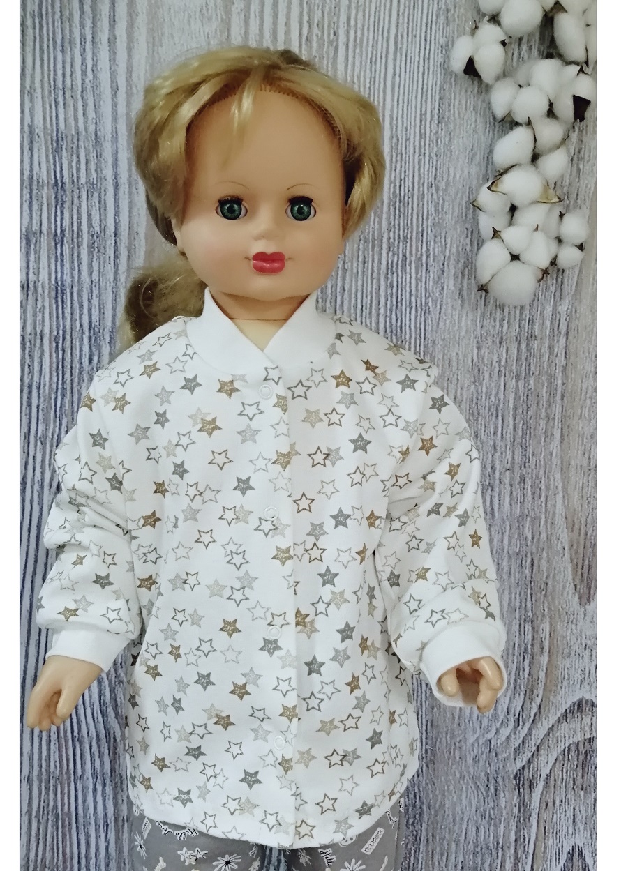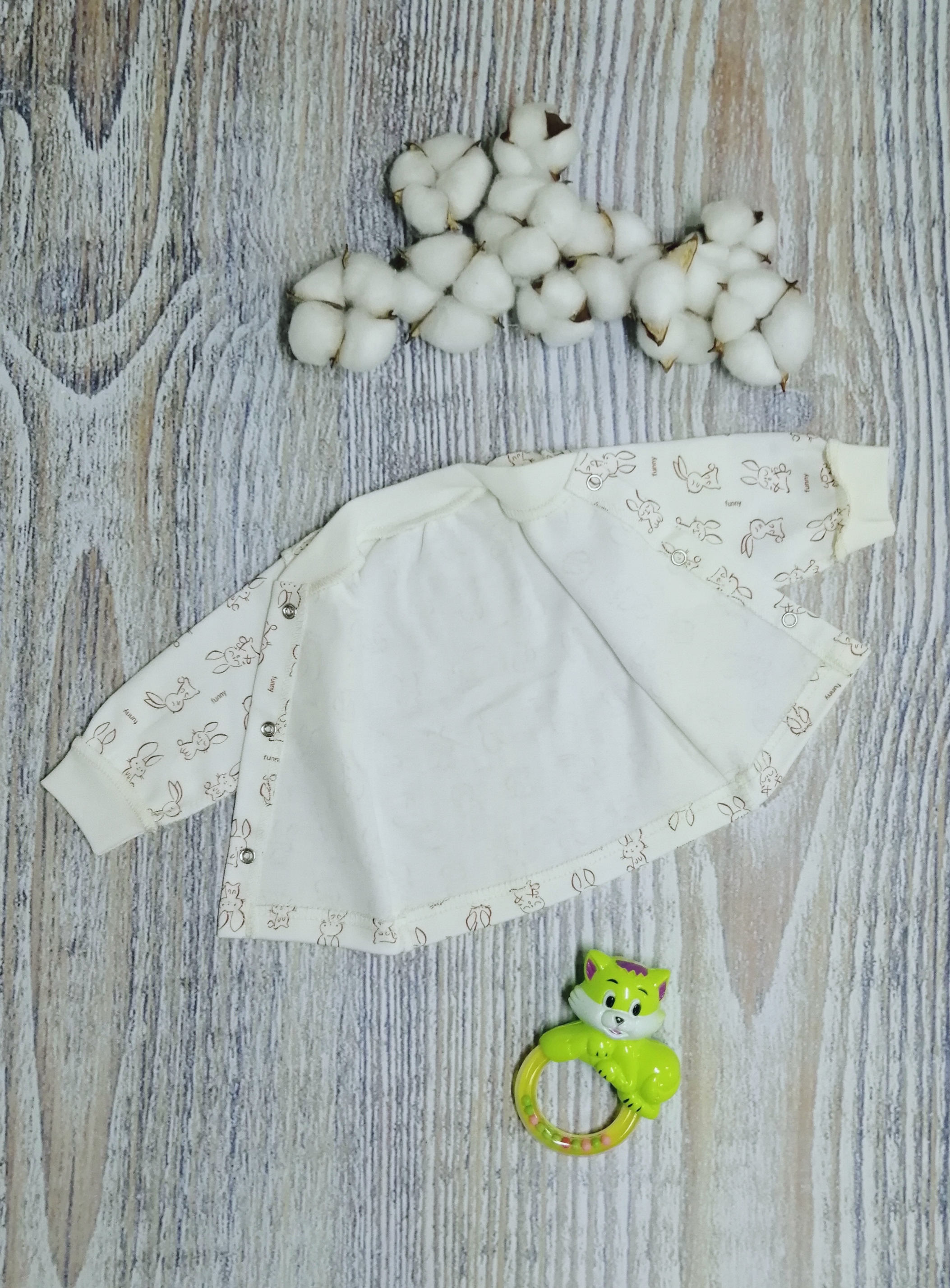 Кофточка без воротника, с длинным рукавом на манжетиках, на кнопочках спереди. Рисунки в каждой партии и упаковке могут отличаться.