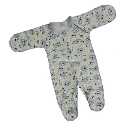 Комбинезон со швами наружу, с закрытыми ручками и ножками, спереди и между ножек на кнопочках.