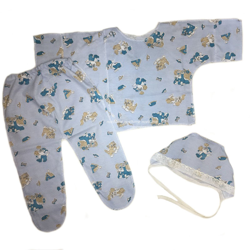 Комплект состоит из распашонки с рукавчиками трансформерами и с кнопочкой на одной стороне, ползунков на резинке, чепчика. Все швы у набора выполнены наружу. Рисунки в каждой партии отличаются.