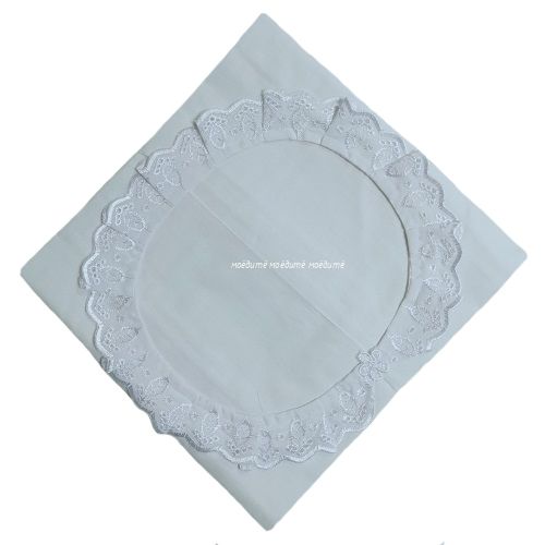 Пододеяльник выполнен из белой бязи с отделкой рюшей белого цвета. Размер 120*120 см. Одеяло заправляется сверху.